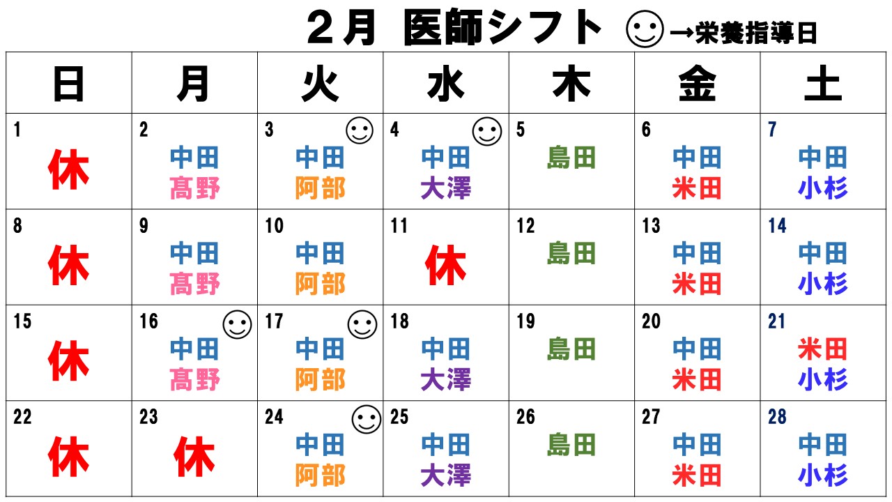 2月 医師シフト■ 2026年1月16日 2月の医師シフトを掲載致します。 医師の希望がある方はご確認の上、来院くださいますようお願いいたします。 ※2/21(土)は中田院長不在となります。 院長の診察ご希望の方は、別日でのご来院をお願いします。